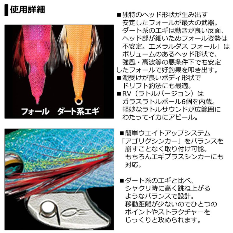 DAIWA EMERALDAS FALLダイワ エメラルダス フォール●サイズ:3.5号●ウェイト:21g●フォールスピード:3.5秒/m詳細はこちら