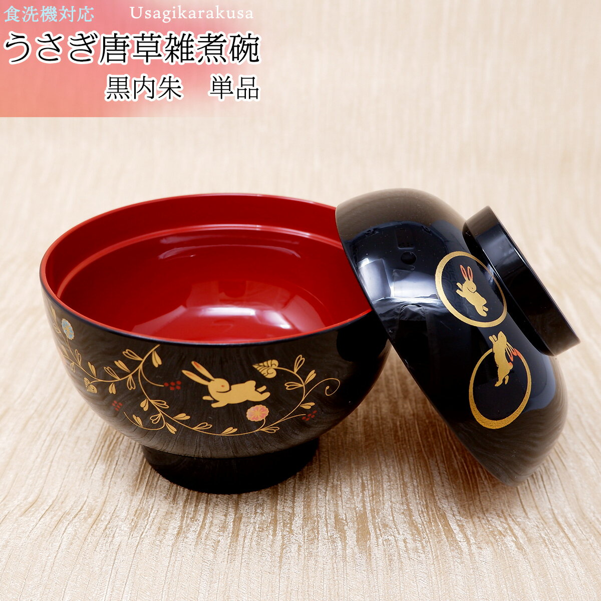 うさぎ唐草 雑煮碗 黒内朱(3T-212) 【食洗器対応】 直径:13.5cm×高さ11.5cm 重量:220g 容量:450cc(8分目) 耐熱ABS樹脂(ウレタン塗装) 日本製 山中漆器 化粧箱入り 【使用上のご注意】 ※電子レンジ・オーブン不可 ※直射日光・高温は避けて保管しておいて下さい。